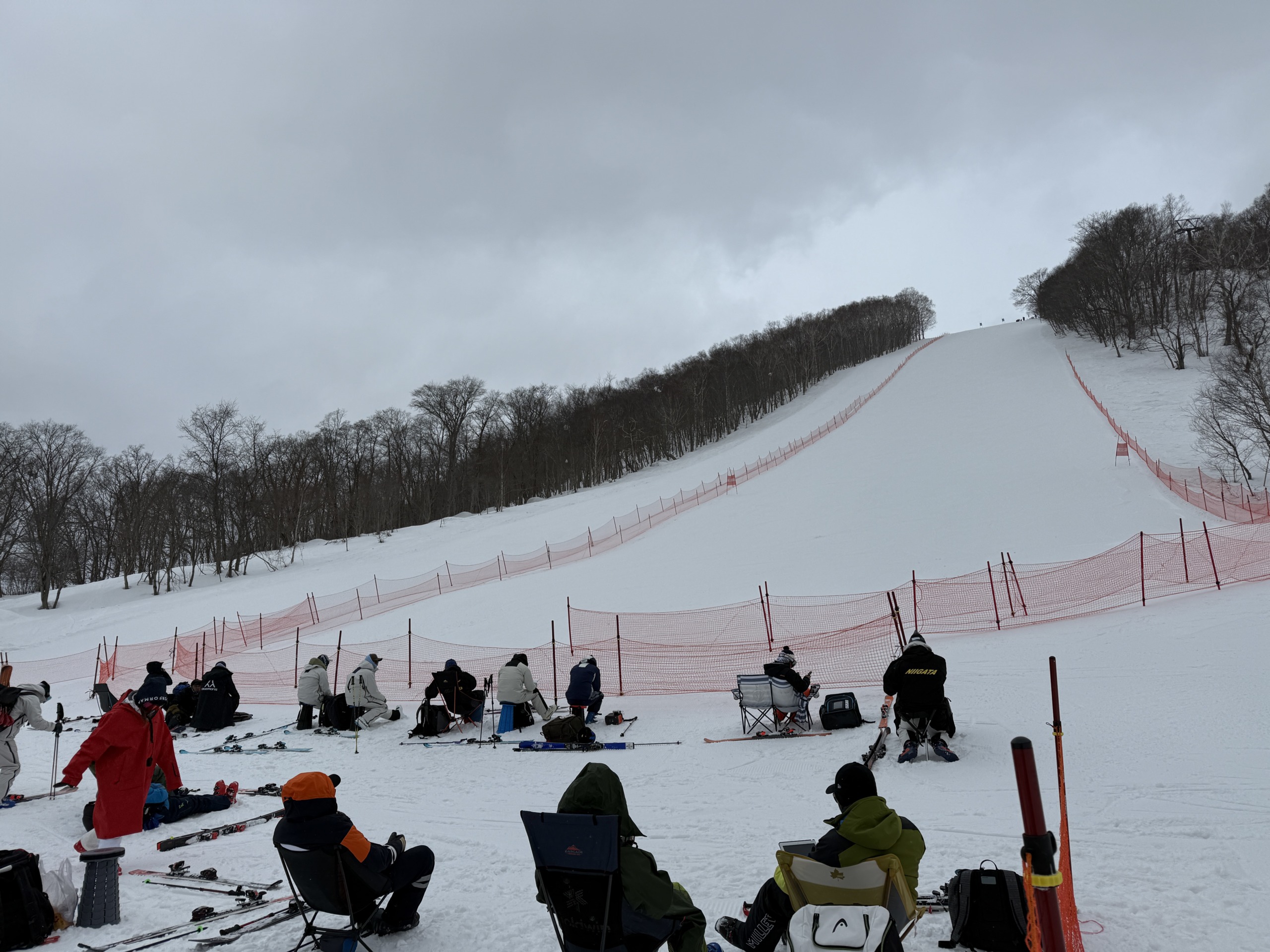 筆者もコーチインスペクションでジャイアントコースをサイドスリップ(横滑り)で試走を したが、大変滑りにくいコース状況だ。ここ数日の暖かな天候で緩んだ雪が夜間に凍ってハードバーンとなる。加えてまるで砂のような雪で覆われる状況。これは足場がなくスキーも動かしづらいだろうな・・・と感じた。やはりジャイアントコースを滑ってくる選手はかな り苦労している。ゴールエリアで待ち構えているエリアに来た選手が「足場がない・・・」 と漏らす。一部の上位と思われる選手はこのようなバーン状況でも難なく滑り降りてく る・・・