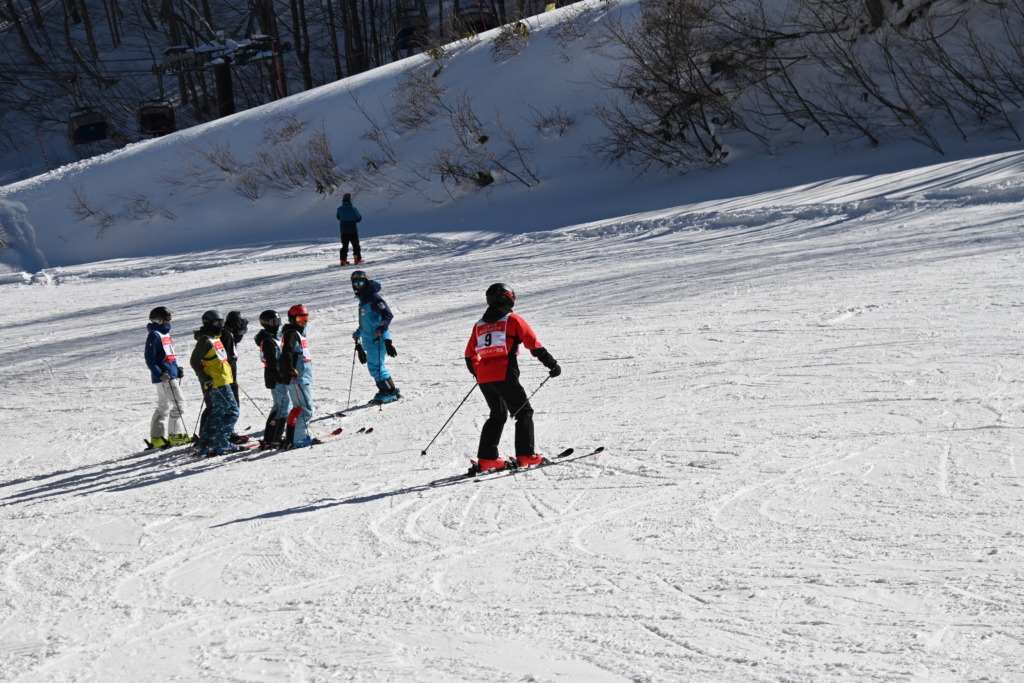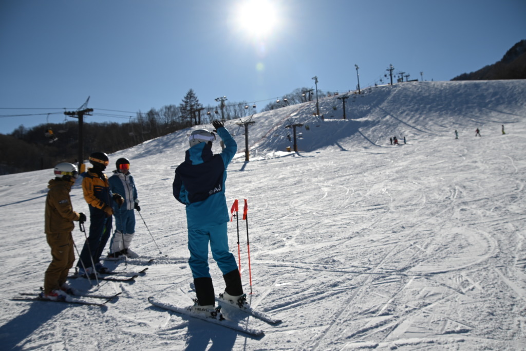 初日は抜けるような青空のもと、前回の養成講習会に引き続き基礎の確認からはじまり、スキー技術の理解度を確認するための検定種目の講習へと移りました。